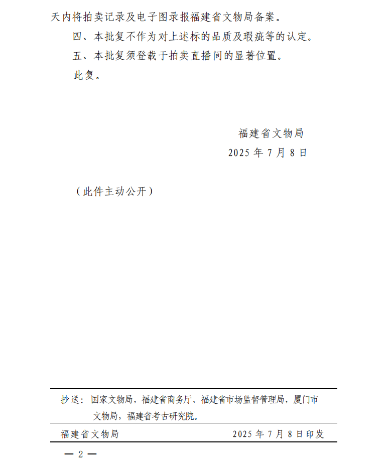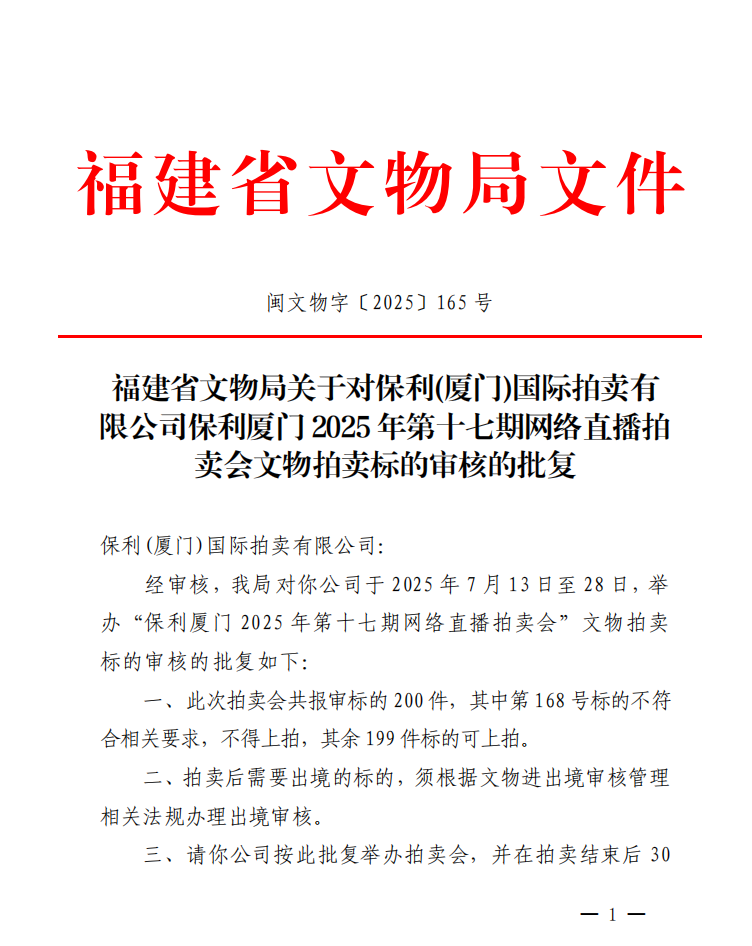 福建省文物局关于对保利(厦门)国际拍卖有限公司保利厦门2025年第十七期网络直播拍卖会文物拍卖标的审核的批复
