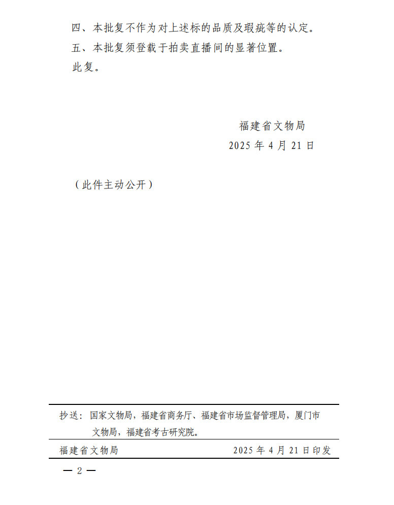 福建省文物局关于对保利(厦门)国际拍卖有限公司保利厦门2025年第十期网络直播 拍卖会文物拍卖标的审核的批复