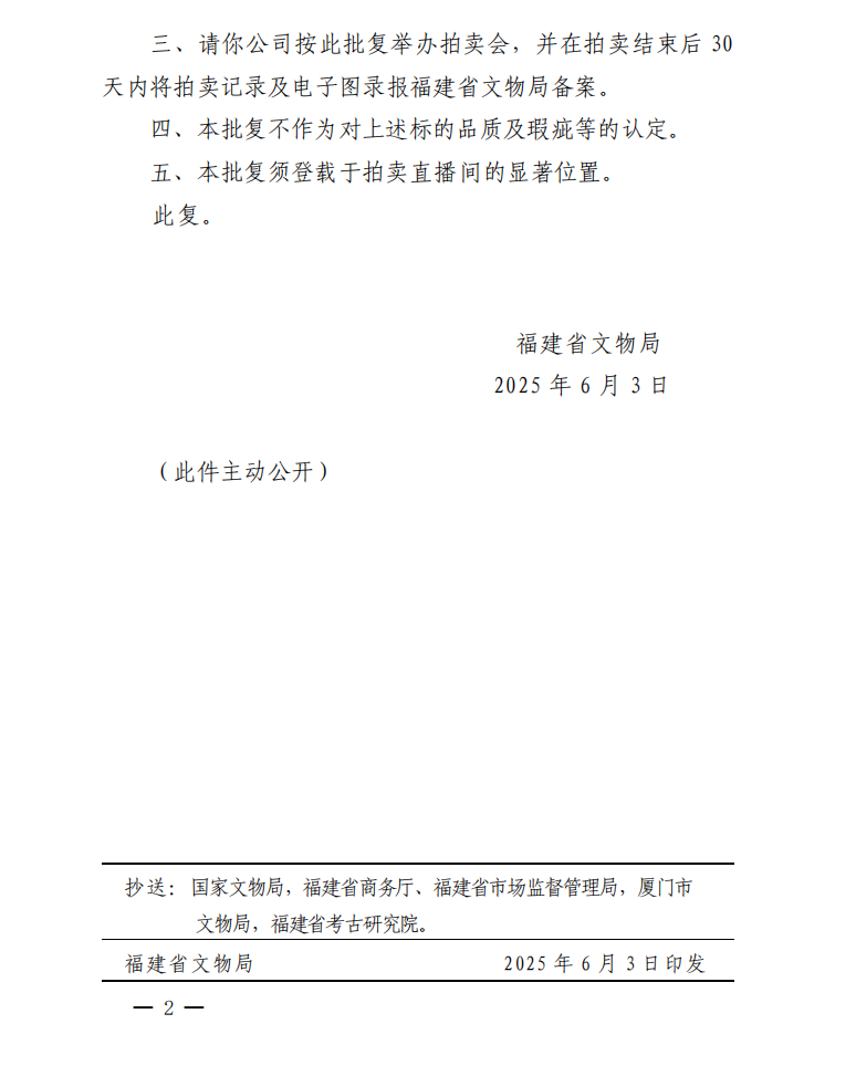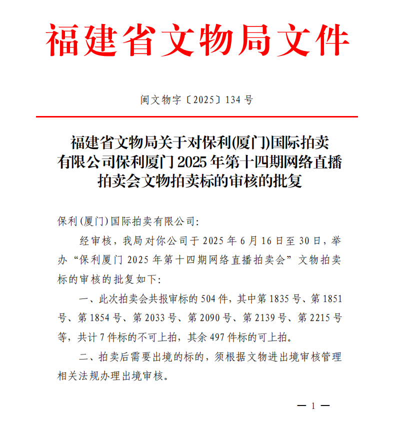 福建省文物局关于对保利(厦门)国际拍卖有限公司保利厦门2025年第十四期网络直播拍卖会文物拍卖标的审核的批复