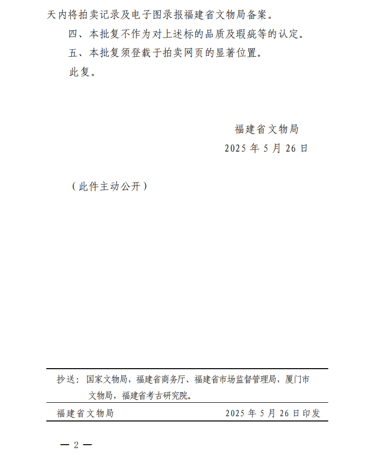 福建省文物局关于对保利(厦门)国际拍卖有限公司保利厦门2025年第四期网络拍卖会文物拍卖标的审核的批复