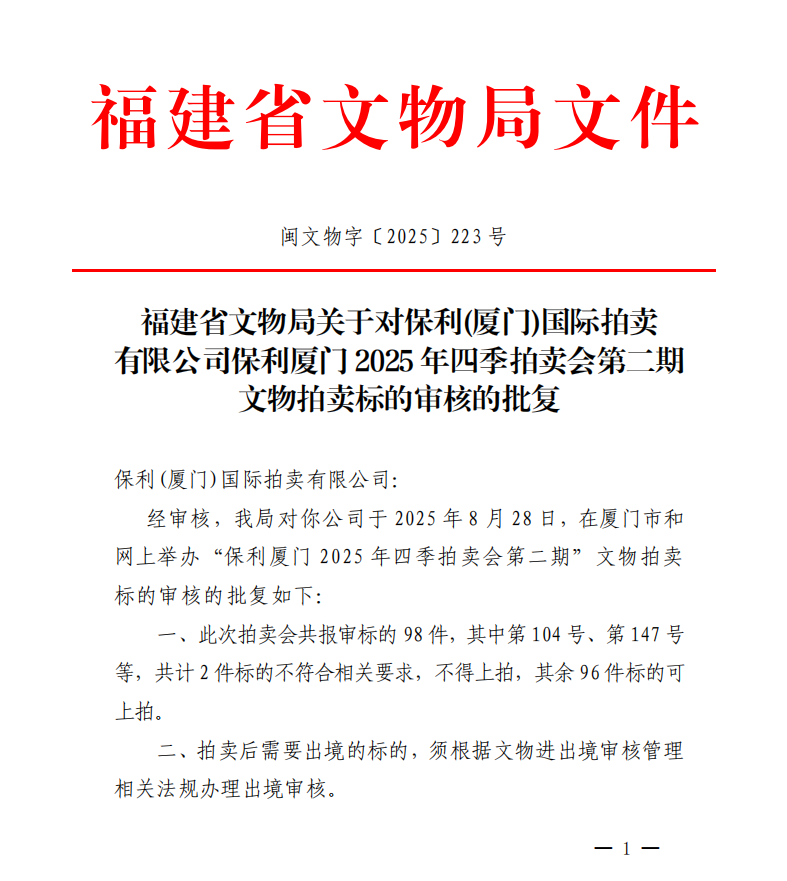 福建省文物局关于对保利(厦门)国际拍卖有限公司保利厦门2025年四季拍卖会第二期文物拍卖标的审核的批复