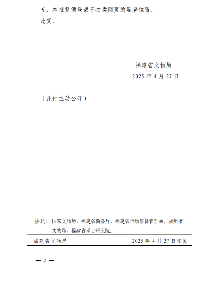 福建省文物局关于对福建静轩拍卖有限公司静轩集珍网络拍卖会第十六期文物拍卖标的审核的批复