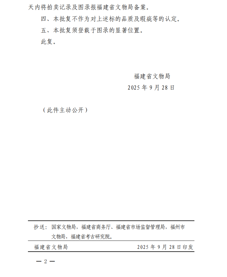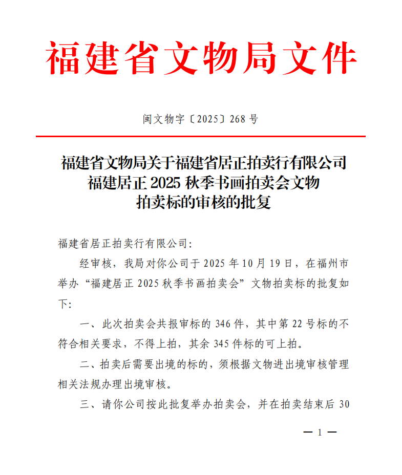 福建省文物局关于福建省居正拍卖行有限公司福建居正2025秋季书画拍卖会文物拍卖标的审核的批复