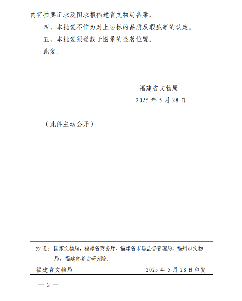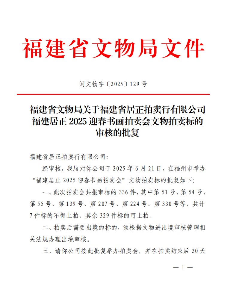 福建省文物局关于福建省居正拍卖行有限公司福建居正2025迎春书画拍卖会文物拍卖标的审核的批复