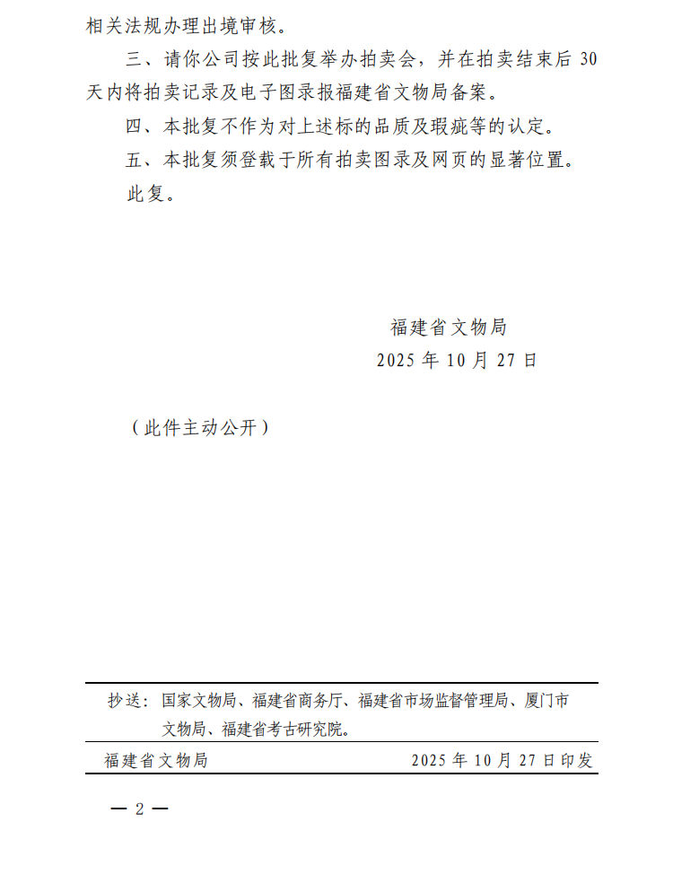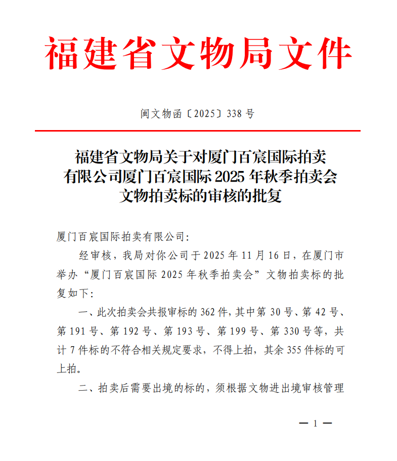 福建省文物局关于对厦门百宸国际拍卖有限公司厦门百宸国际2025年秋季拍卖会文物拍卖标的审核的批复
