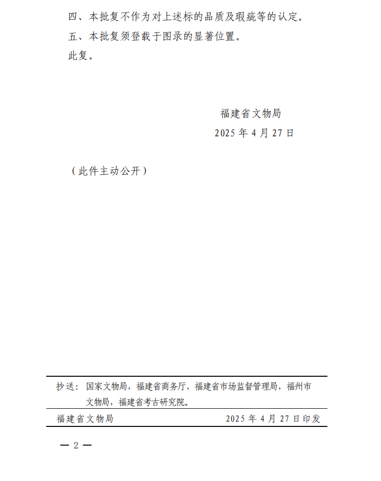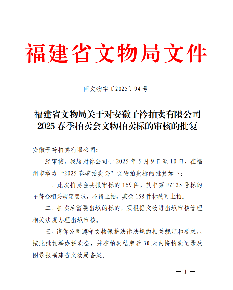 福建省文物局关于对安徽子衿拍卖有限公司2025春季拍卖会文物拍卖标的审核的批复
