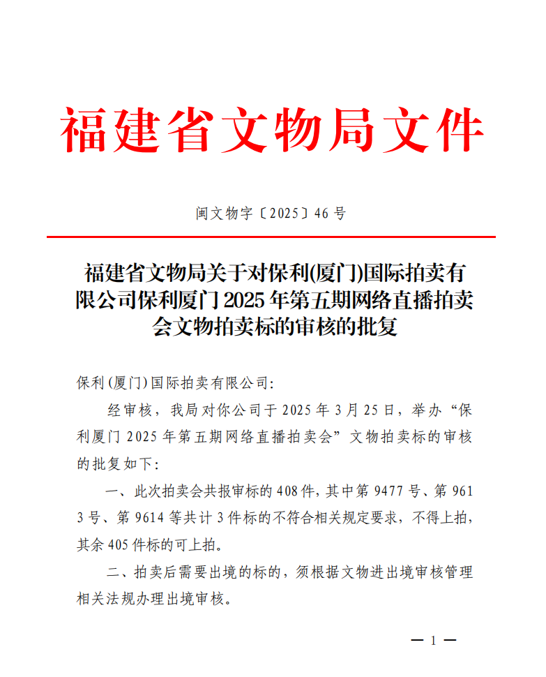 福建省文物局关于对保利(厦门)国际拍卖有限公司保利厦门2025年第五期网络直播拍卖会文物拍卖标的审核的批复