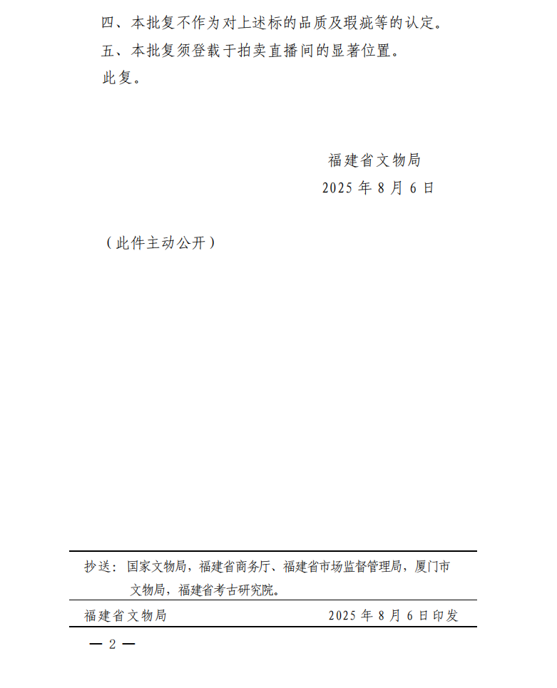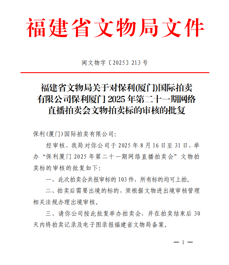 福建省文物局关于对保利(厦门)国际拍卖有限公司保利厦门2025年第二十一期网络直播拍卖会文物拍卖标的审核的批复