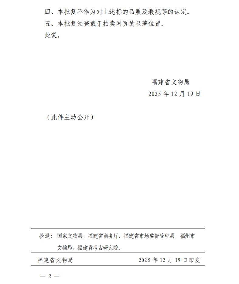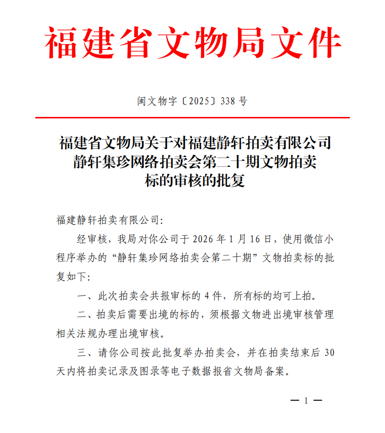 福建省文物局关于对福建静轩拍卖有限公司静轩集珍网络拍卖会第二十期文物拍卖标的审核的批复