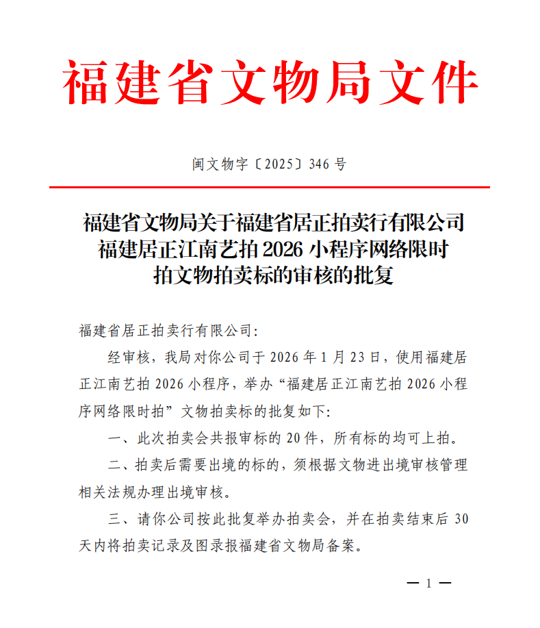 福建省文物局关于福建省居正拍卖行有限公司福建居正江南艺拍2026小程序网络限时拍文物拍卖标的审核的批复