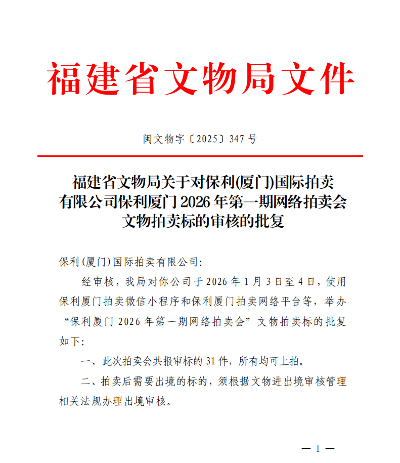 福建省文物局关于对保利(厦门)国际拍卖有限公司保利厦门2026年第一期网络拍卖会文物拍卖标的审核的批复