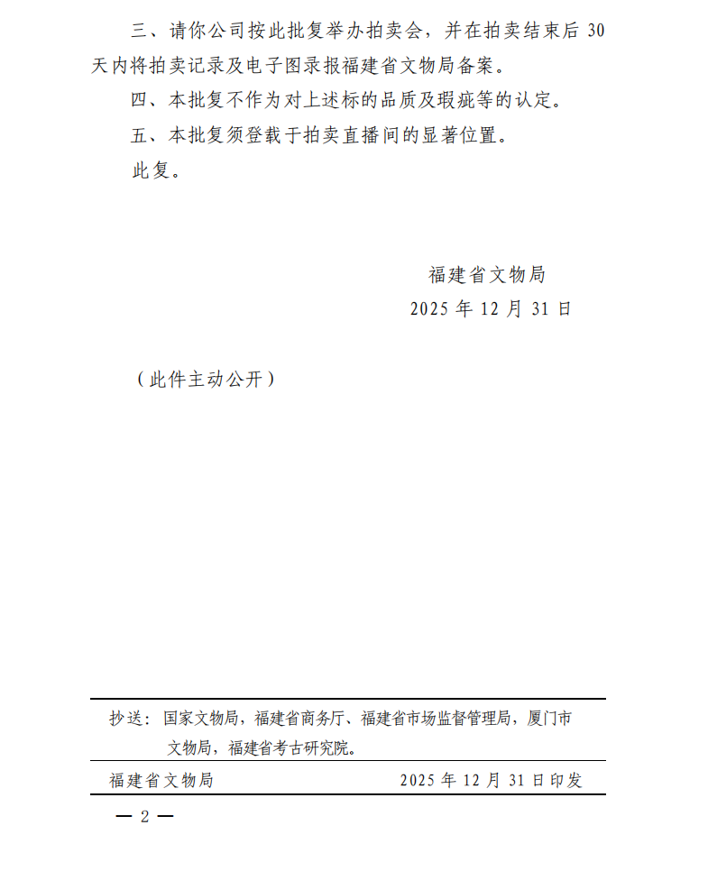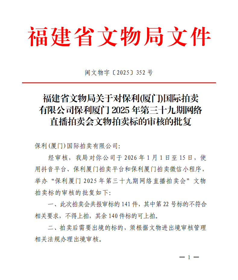 福建省文物局关于对保利(厦门)国际拍卖有限公司保利厦门2025年第三十九期网络直播拍卖会文物拍卖标的审核的批复