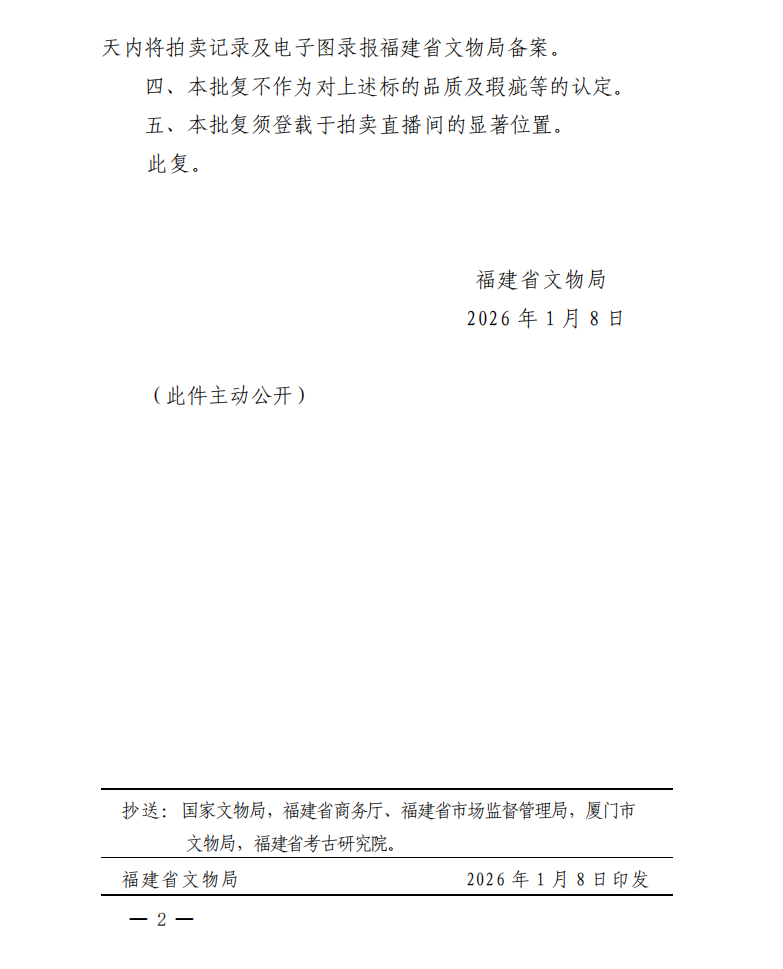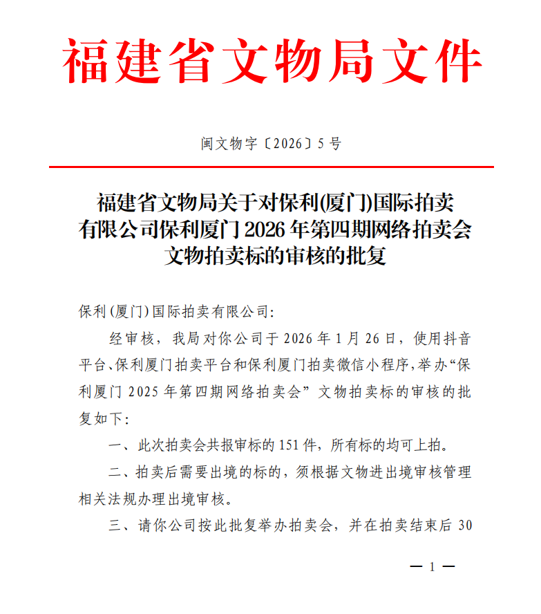 福建省文物局关于对保利(厦门)国际拍卖有限公司保利厦门2026年第四期网络拍卖会文物拍卖标的审核的批复