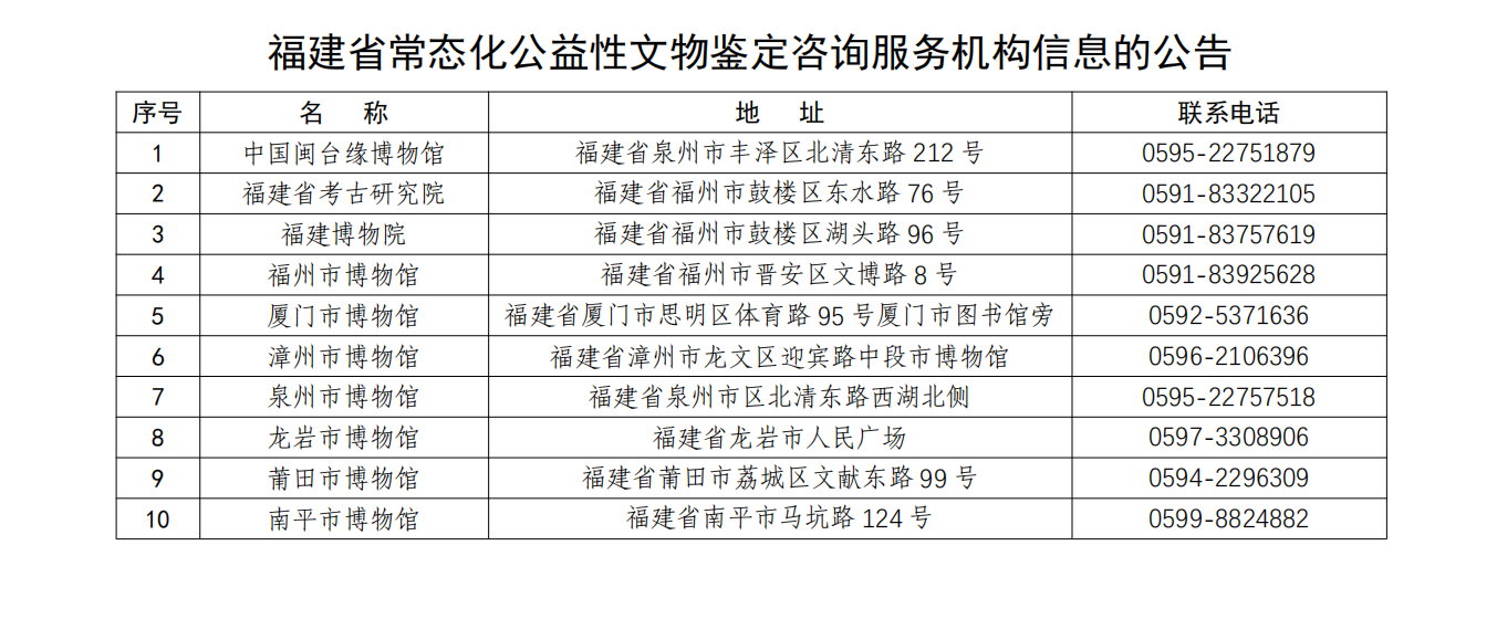 福建省常态化公益性文物鉴定咨询服务机构信息的公告
