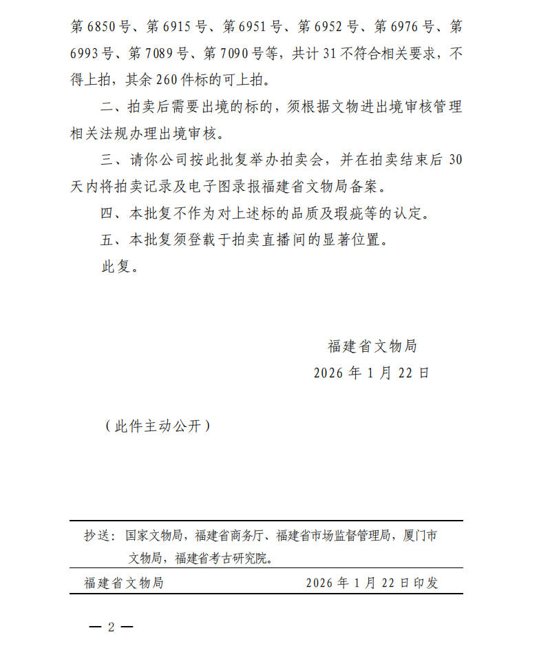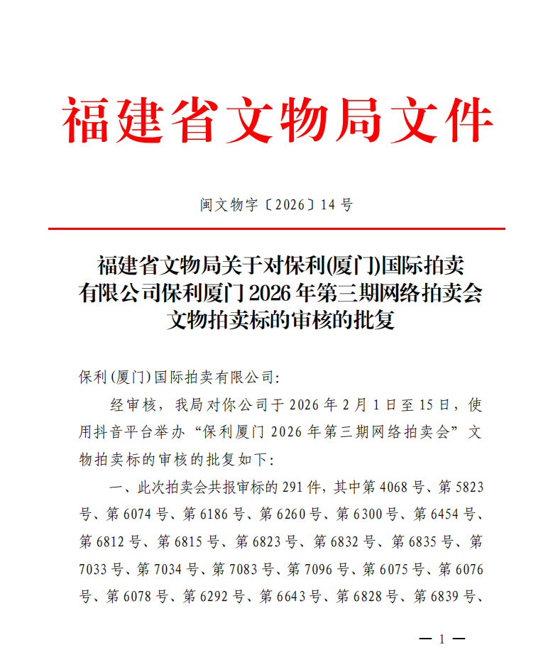 福建省文物局关于对保利(厦门)国际拍卖有限公司保利厦门2026年第三期网络拍卖会文物拍卖标的审核的批复