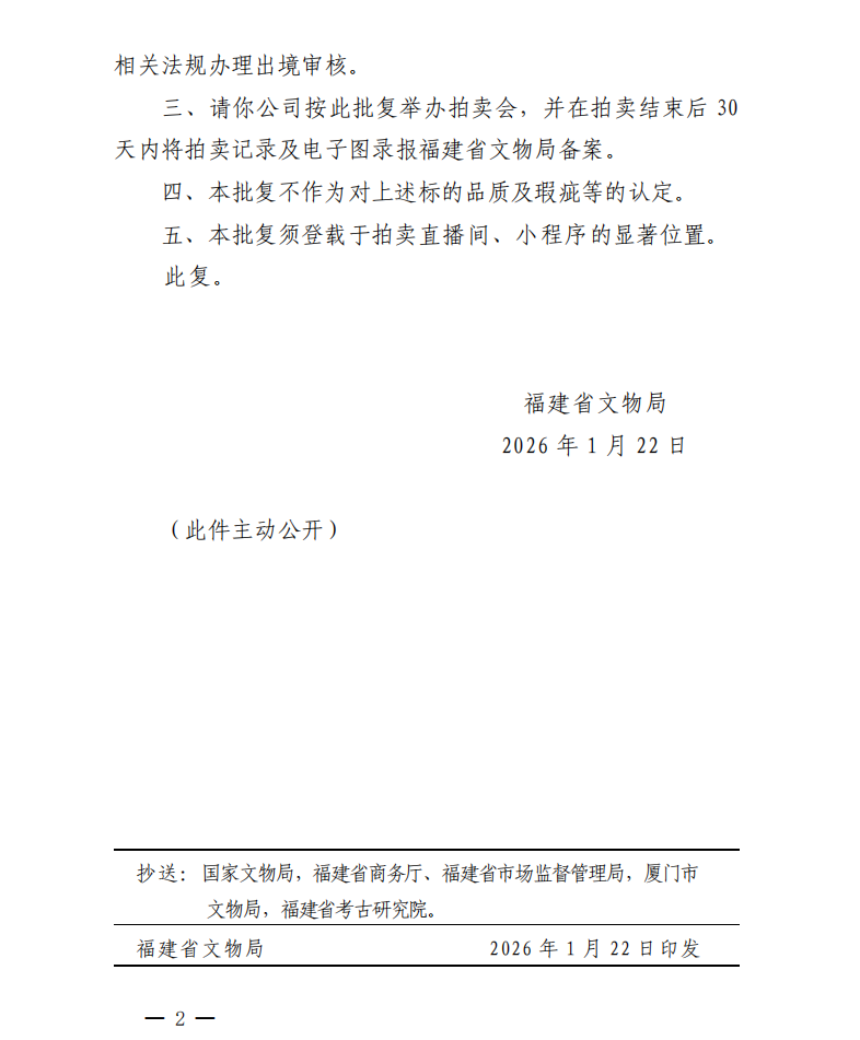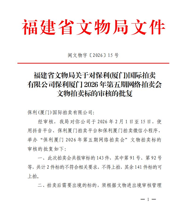 福建省文物局关于对保利(厦门)国际拍卖有限公司保利厦门2026年第五期网络拍卖会文物拍卖标的审核的批复