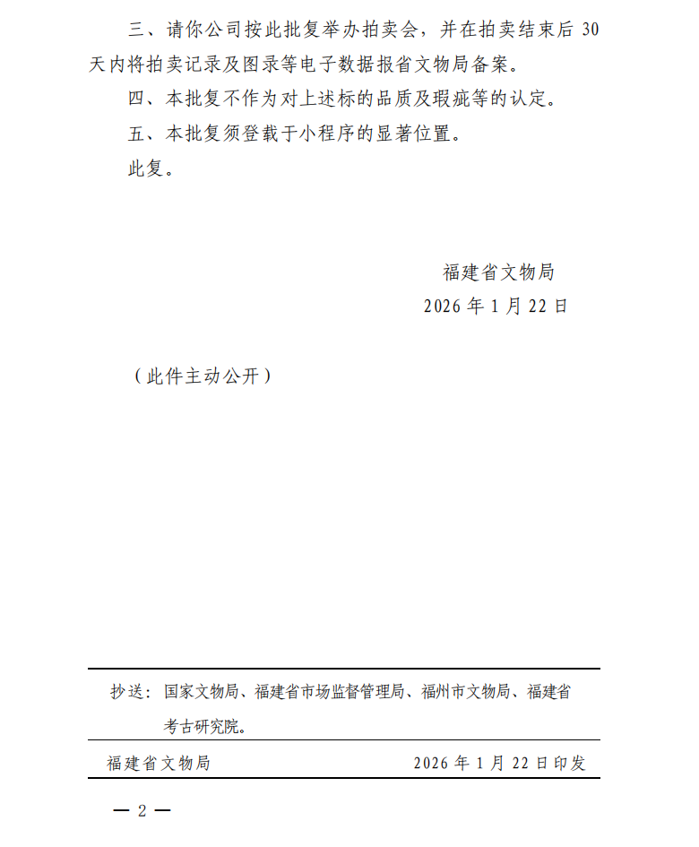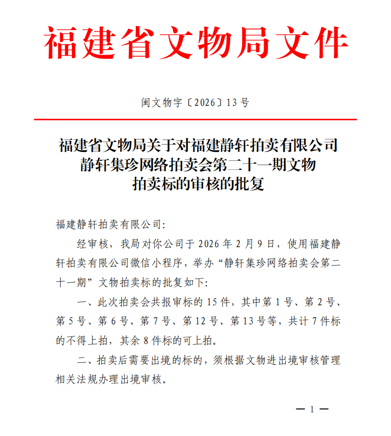 福建省文物局关于对福建静轩拍卖有限公司静轩集珍网络拍卖会第二十一期文物拍卖标的审核的批复