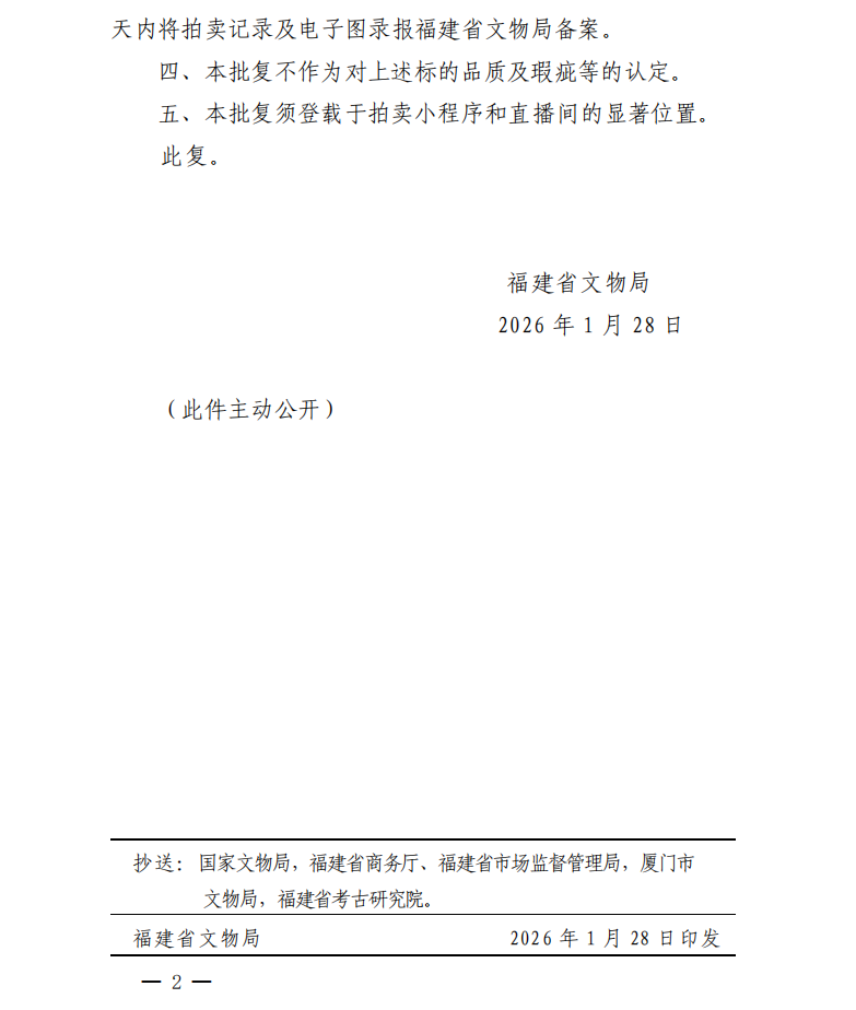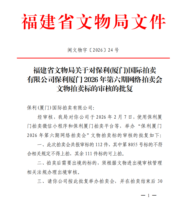 福建省文物局关于对保利(厦门)国际拍卖有限公司保利厦门2026年第六期网络拍卖会文物拍卖标的审核的批复