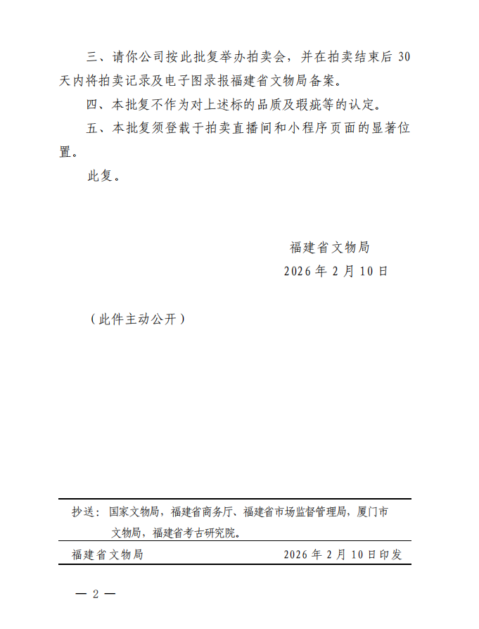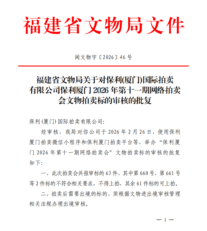 福建省文物局关于对保利(厦门)国际拍卖有限公司保利厦门2026年第十一期网络拍卖会文物拍卖标的审核的批复
