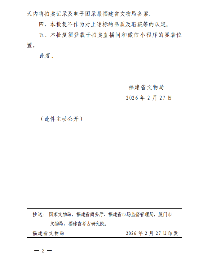 福建省文物局关于对保利(厦门)国际拍卖有限公司保利厦门2026年第十五期网络拍卖会文物拍卖标的审核的批复