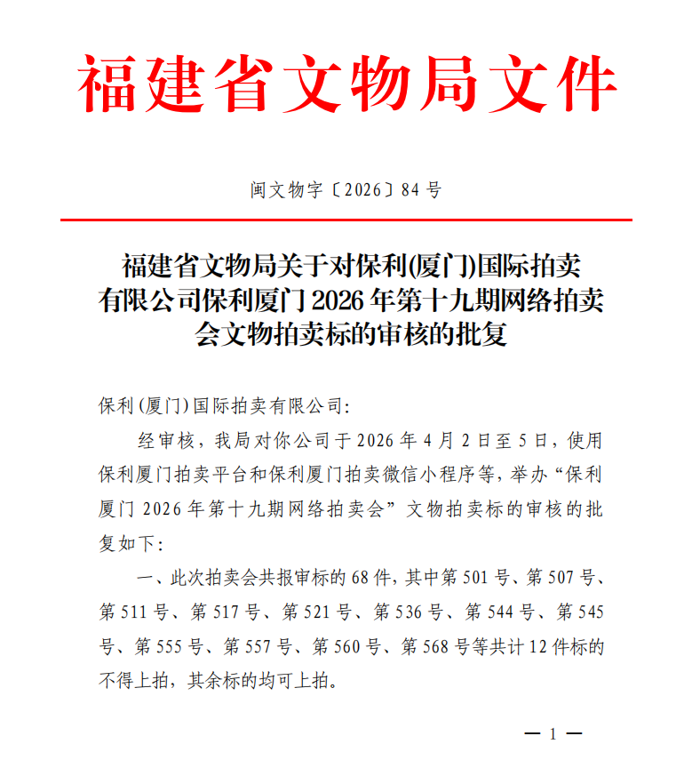 福建省文物局关于对保利(厦门)国际拍卖有限公司保利厦门2026年第十九期网络拍卖会文物拍卖标的审核的批复