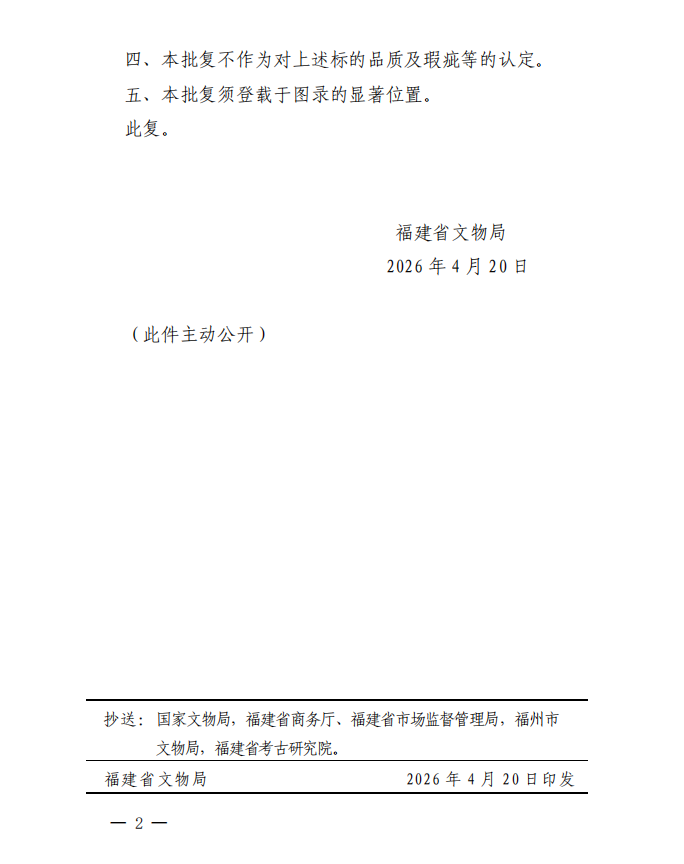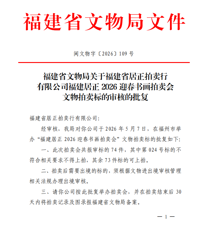 福建省文物局关于福建省居正拍卖行有限公司福建居正2026迎春书画拍卖会文物拍卖标的审核的批复