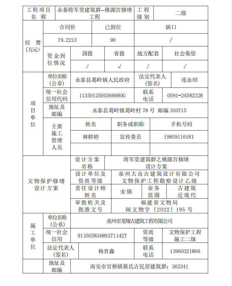 闽文物工程〔2025〕44号永泰将军堂建筑群-桃源宫修缮工程